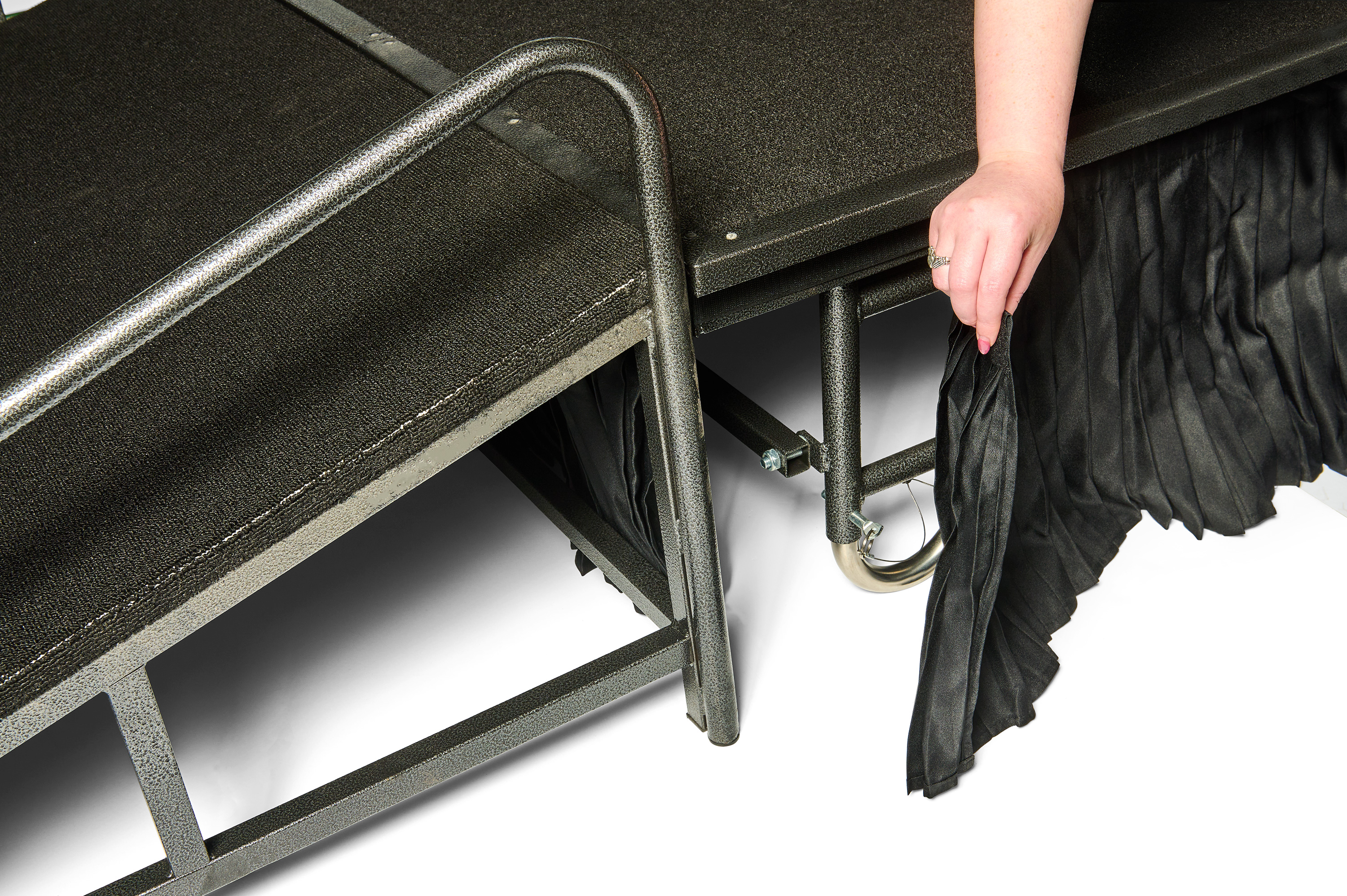 Let us set the stage for you: you have an event coming up and are looking to take it to the next level. Whether it’s a religious function, fundraiser, graduation, or any other type of event where you want to rise above the crowd, Displays2go’s event stage kits are the perfect solution. These portable stages come in your choice of 3 or 4 platforms to make the size stage that is best for your event. Each kit includes a ramp, stairs, railings, and skirts to give you a complete stage setup that will bring a touch of professionalism to your function. Each platform is made of durable plywood on a sleek steel base covered in a lush black carpet, and measures 4’ W x 8’ D, making it an ideal size for any event. The platforms and ramps are both equipped with wheels for easy transportation, and all other elements are lightweight and store well in sturdy cardboard boxes. Each platform has a weight capacity of 3,307 lbs., meaning you can add banners, backwalls, podiums, chairs, décor, and more to really customize the space for your needs. A complete portable event stage platform kit is a sound investment for any church, school, event venue, or anyone else looking to make their next event a success. Note: The ramps for the event stages are not ADA compliant.