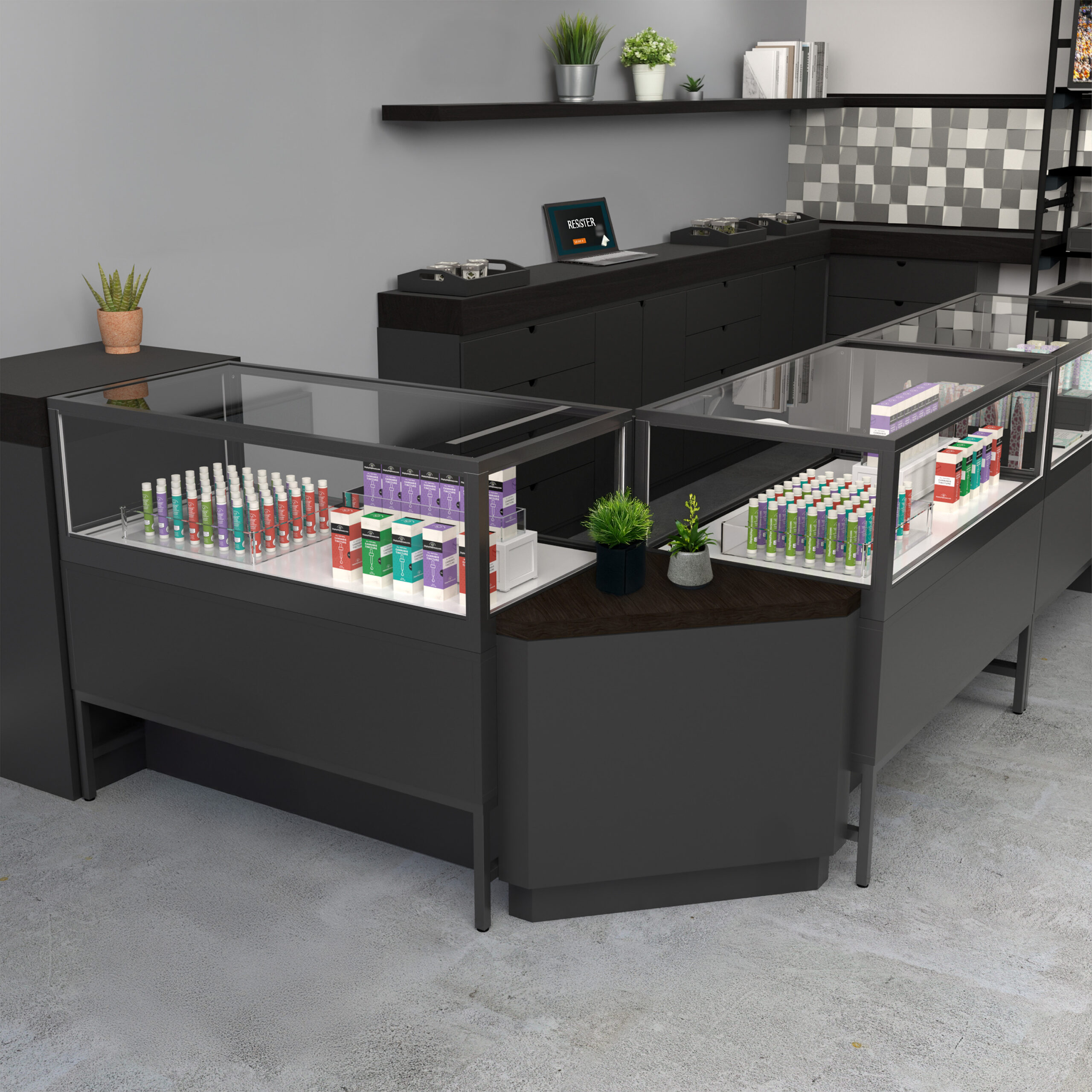 Efficiently transform corner space into functional, eye-catching display areas with the deluxe retail corner counter, designed to create a seamless right-angle transition between cash wraps and showcases. Ideal for showcasing featured products, promotional merchandise, or sales literature, this fully assembled pedestal features durable melamine construction and is available in two sophisticated finishes: a matte white base with a raw oak melamine top, and a matte black base with a matching matte black top. The decorative reveal beneath the countertop adds a refined design detail, making this retail corner counter a practical and stylish addition to any dispensary retail environment.