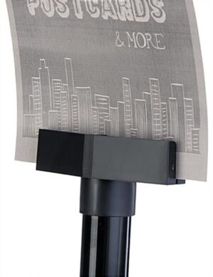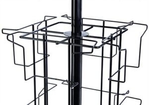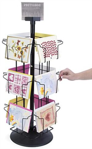 This postcard carousel is a 12 pocket greeting card holder. The stand displays your 7” x 5” stock in horizontal view. On countertops, customers can rotate the greeting card carousel to see all four sides of the holder. Allow the rack to spin on the sturdy plastic base while patrons stand in place. Design and print your own graphic to insert into the included sign clip on the carousel to help advertise the stock on display. This stand is constructed of black steel wire and assembles easily without tools for your convenience.