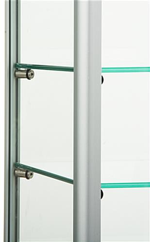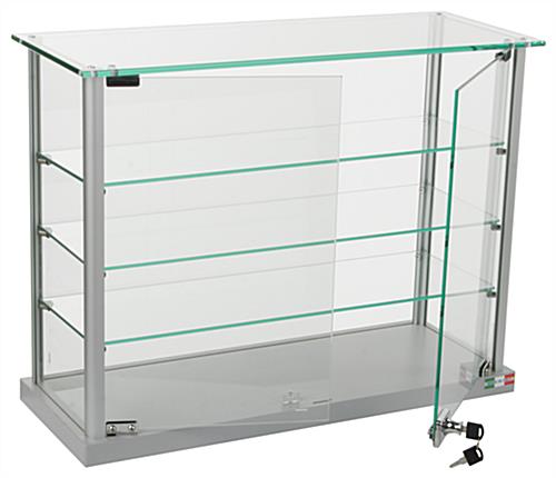This aluminum display case is intended to be placed on a countertop and model products. The tempered glass construction and silver framing design helps achieve a simple and professional arrangement. Model and showcase delicate, expensive, and valuable merchandise behind the locking doors. Rather than using a wall mounted cabinet, each countertop display case allows customers to view items more closely before asking for assistance. Three height adjustable shelves and a tempered glass top canopy complement the products within these locking store fixtures. Complete merchandising arrangements with a display case that is compact enough to hold watches, jewelry, electronics, and collectible trinkets.