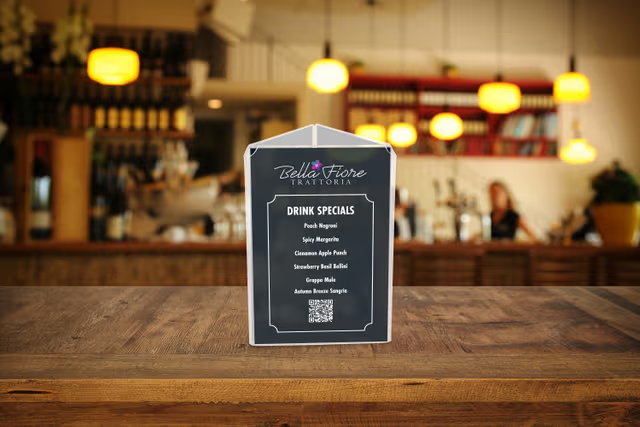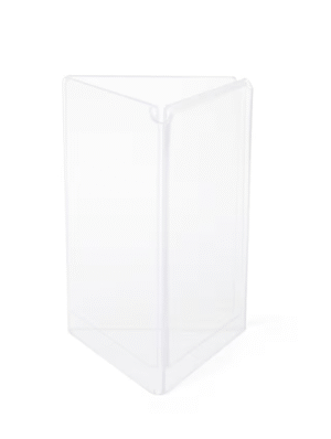 This eco-friendly table sign holder is crafted from recycled acrylic and features a tri-fold design with three clear panels for displaying a number of graphics sizes, making it ideal for restaurants, bars, retail stores, offices, and hotels. Its three-sided structure allows for multiple messages or repeated content to maximize visibility from all angles, while the bottom-loading or slide-in design ensures quick and easy updates. The transparent construction offers full graphic exposure and blends seamlessly with any décor. Perfect for menus, promotions, announcements, or personal photos, this table sign holder combines sustainability, versatility, and style in one compact unit.