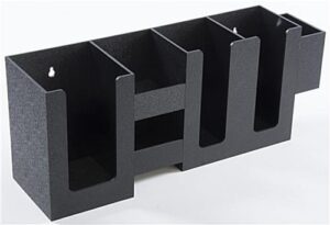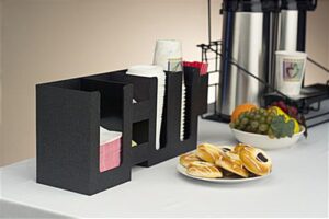 This coffee condiment organizer has six sections for holding sugar packets, creamers, lids, cups, and stirrers. Restaurants and cafés can offer customers accompaniments to tea or other beverages using the holder. Each black organizer with six sections is wall mountable as well as suitable for tabletop use. Every accessories caddy includes sections in a variety of sizes, ideal for holding different supplies. Customers can serve themselves tea or other hot beverages with the help of an organizer. Easily create an attractive display of beverage condiments using a black accessories caddy!