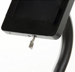 This tablet pedestal stand has a height of 49” from the base and a curved design. An iPad kiosk is a great way to catch a customer’s eye in store displays by incorporating newer forms of technology. The adjustable pedestal stand can rotate 360° and tilt. A locking enclosure and a hidden home button