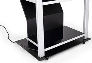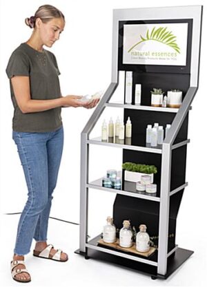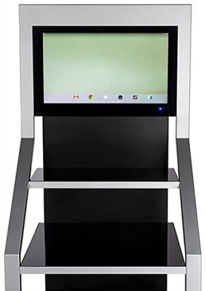 This digital merchandising retail shelving unit with a 21.5″ Android-powered LCD screen will give your boutique, liquor shop, or department store displays a modern and sleek upgrade. This multi-media advertising kiosk will elevate your guest’s shopping experience with engaging and impactful content that can be heard with built-in-speakers! This unique digital merchandising shelving display with a satin finish has three large black tempered glass shelves for storing inventory and a narrow top shelf to showcase samples, brochures, business cards, or test products. The LCD screen with an Android operating system features a slide show app, web browser, Google Play Store, and more. This advertising kiosk also has an Ethernet port, micro SD card, HDMI port, two USB inputs, and built-in speakers providing patrons with a truly immersive shopping experience. Images, videos, slideshows, and GIFs can be supported by this unit, further expanding your marketing possibilities. Choose to share advertising content, product demos, company information, or filmed testimonials on the screen to enhance your store exhibit and increase buyer interest. The included remote allows you to control the multi-media playing on your modern display from far away, minimizing distractions as shoppers are browsing. This digital merchandising shelving will beautifully showcase your brand’s products and services with this contemporary digitalized design that can play content to complement any display!