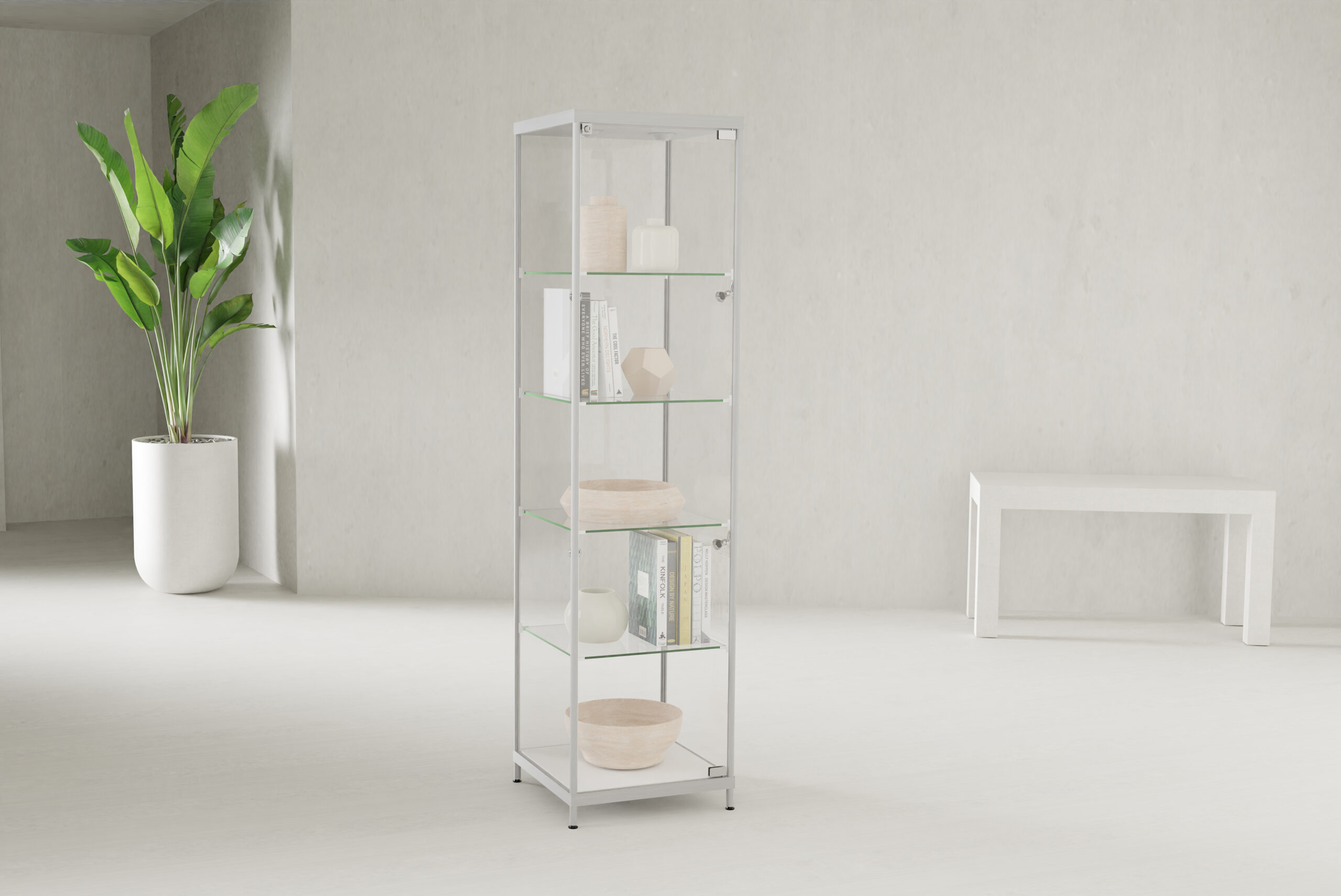 Display Case w/ LED Lighting, 4 Fixed Shelves & Locking Door – Silver