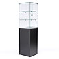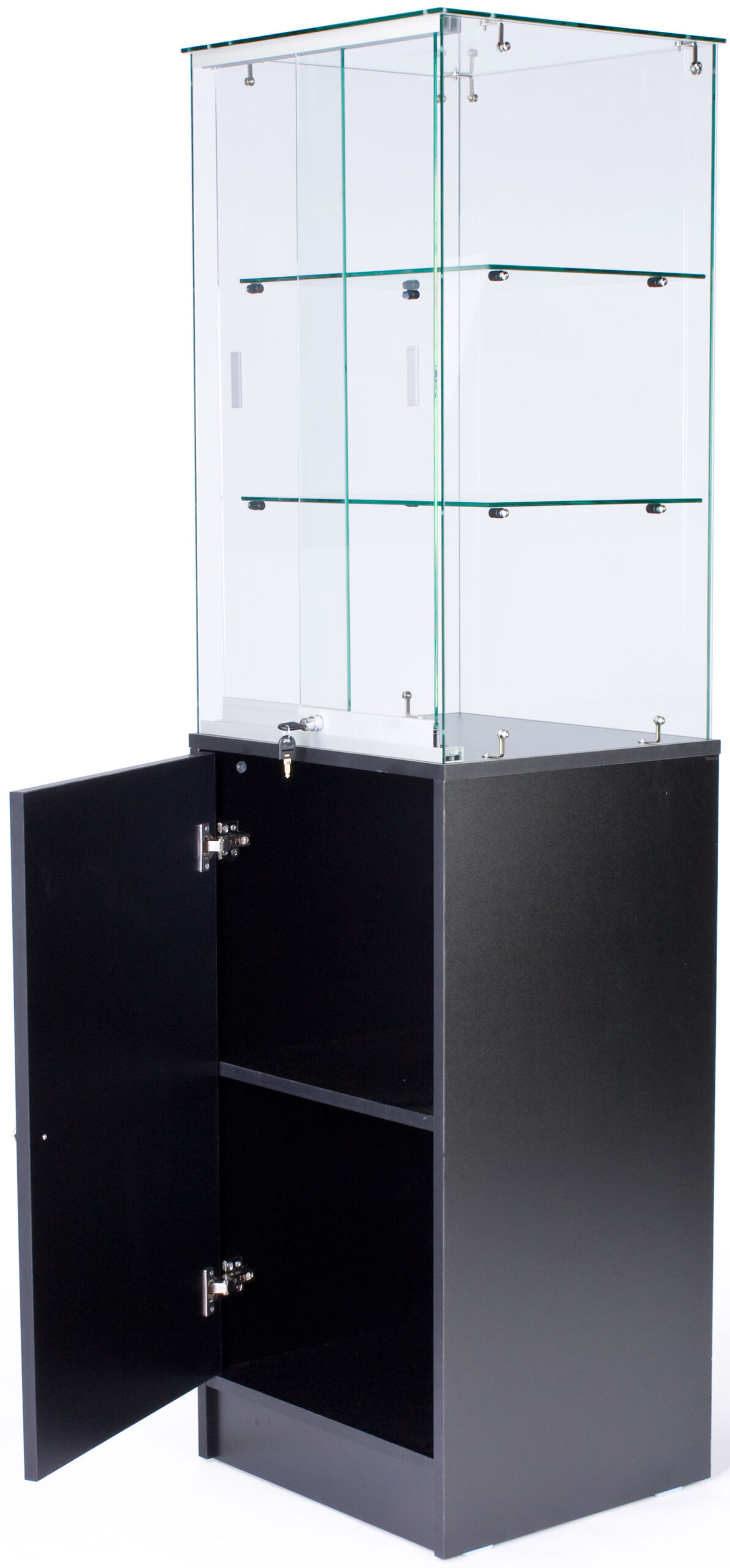 This retail showcase, glass cabinet features a frameless glass design with a black melamine storage cabinet at the bottom. You can showcase your most valuable items at the top while storing additional items below. We manufacture this glass cabinet from tempered glass that is 6mm in thickness for safety purposes. As a result of the frameless construction, items can be viewed from every angle with ease. This display case can be used as part of a configuration to create an entire retail store design or individually, right in the center of your store or museum, showcasing items for all to see. This tower case can be used in museums, gift shops and retail stores for displaying any best selling or new products. This type of cabinet is ideal for displaying jewelry, eyewear or even electronics. Its contemporary styling is perfect for drawing customer attention! Though the two included glass shelves are not height adjustable, you can remove the shelves easily to accommodate larger products. Complete the look of your retail store by adding this display case to your store configuration today!