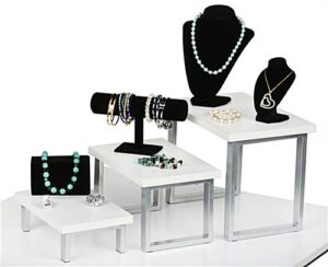 These nesting table risers serve as miniature stands for holding merchandise. Place these items on multi-level retail furniture to create an impressive and eye catching merchandising display! Each of these stacking table risers is equipped with anti-slip padding that ensures secure placement on tabletops. Customers will be wowed by this unit’s semi-gloss white melamine finish and silver powder coated steel frame. These table risers are great for holding folded clothing, jewelry, accessories, packaged goods, or even a piece of signage. Purchase in combination with matching store fixtures to create a cohesive retail display.