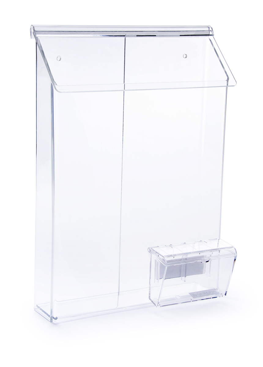 Improve your marketing game with this multipurpose outdoor literature dispenser. Display your single-sheet flyers, magazines, catalogs, and more in this acrylic brochure holder. Providing added functionality, this is a combined literature dispenser with a business card pocket. Designed for interior and exterior use, this brochure holder features an overlapping, hinged lid that protects your flyers from the elements. Each literature dispenser is constructed with two pre-drilled holes for easy wall mounting. Attach the accompanying small front compartment to the acrylic brochure holder before interior or exterior installation. Wall mounting hardware is not included.