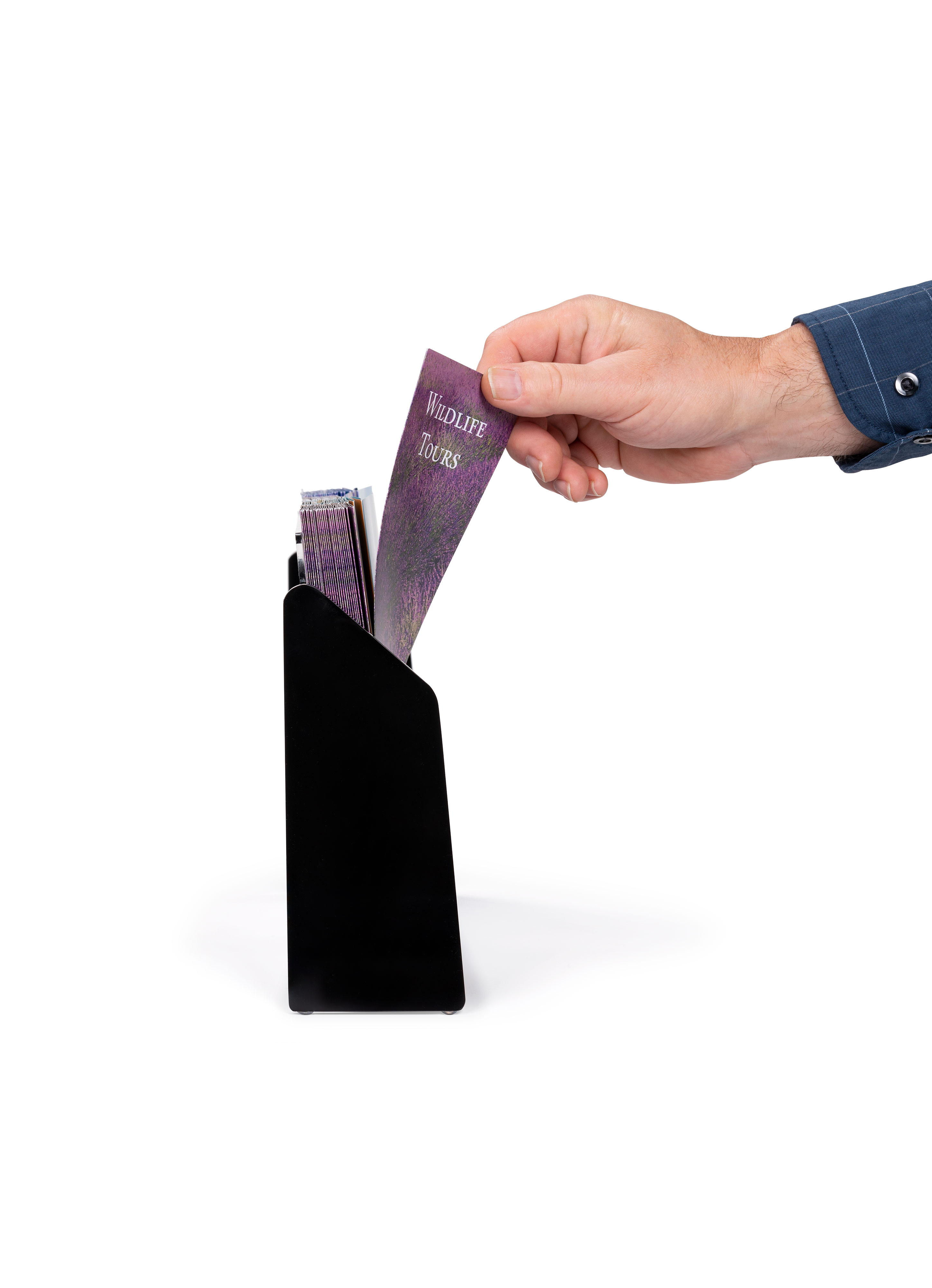 This flyer stand features a classic design that is suitable for any upscale environment. With 4 non-slip rubber stoppers, this literature holder is an acrylic brochure display, perfect for any public countertop area. This flyer rack is commonly seen in travel agencies displaying pamphlets for popular vacation destinations. With the front panel made of a clear acrylic, this literature holder, brochure display protects each pamphlet while still presenting the material clearly. Curious onlookers do not need to lift the reading material out of the pocket in order to view the entire cover. This brochure display, also known as a literature pocket, has two sides made of 3/8″ thick, gloss black acrylic. This is what gives the flyer holder its elegant appearance. This brochure display is the perfect acrylic rack to distribute your materials and more importantly, your message.