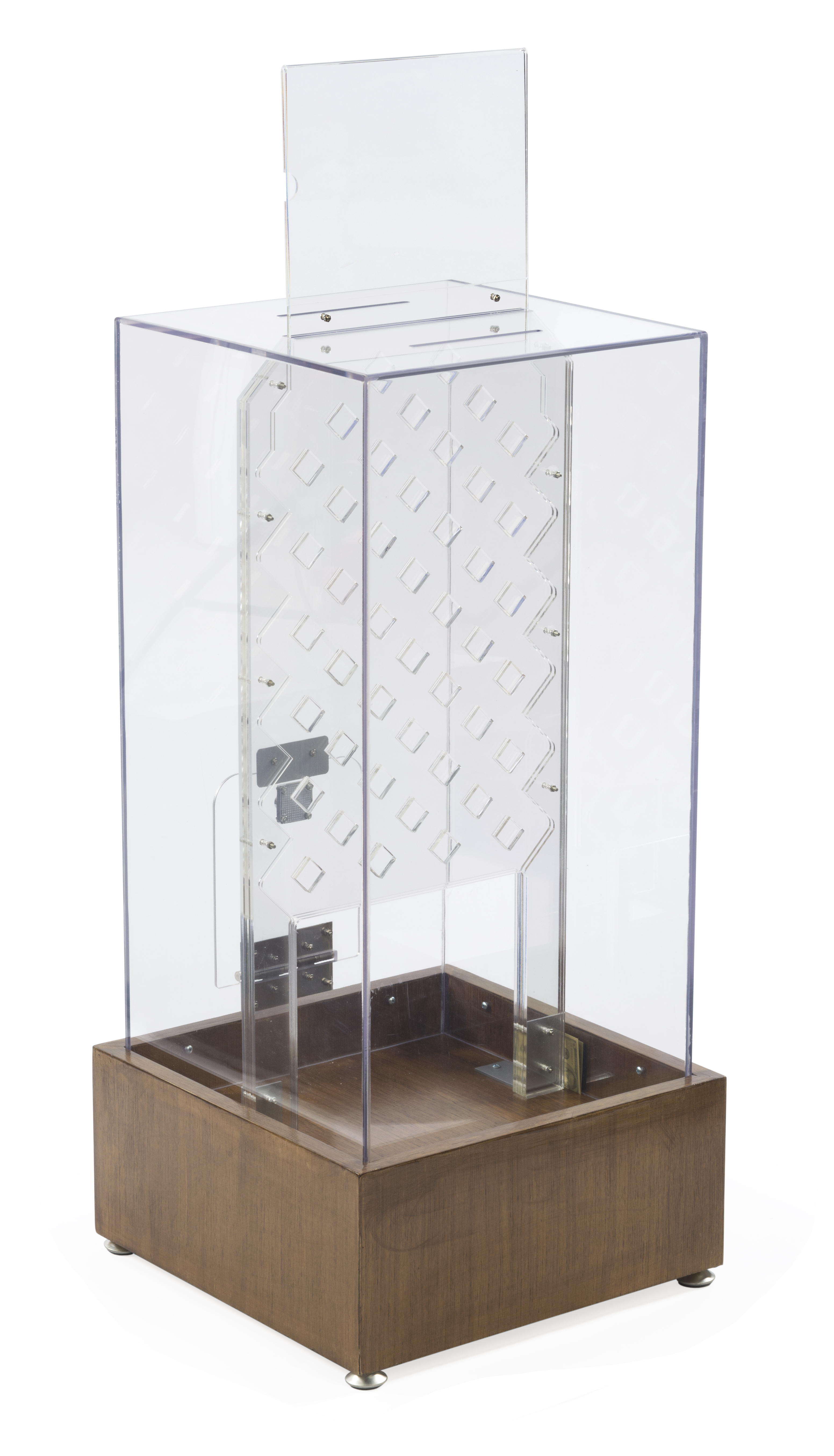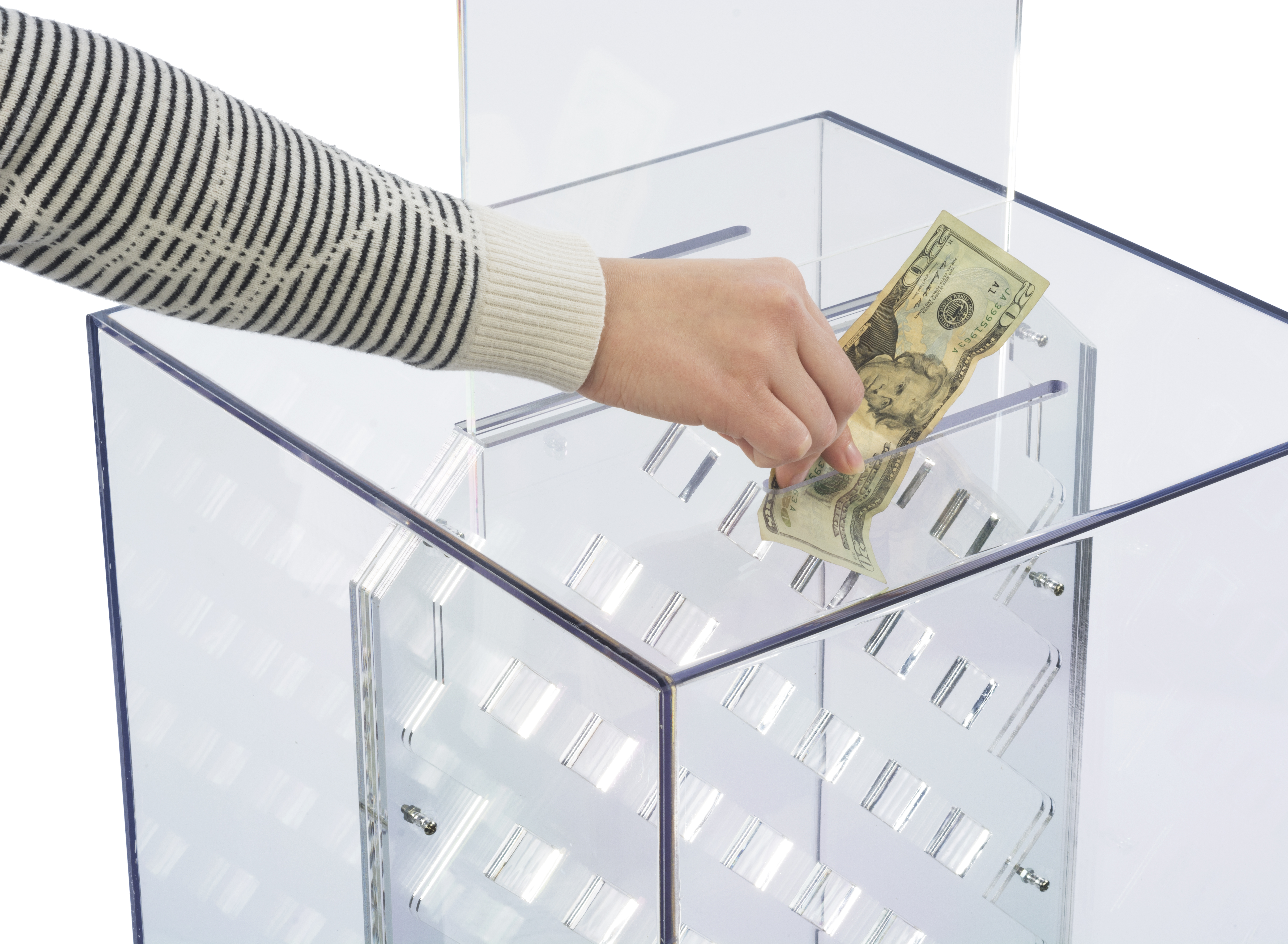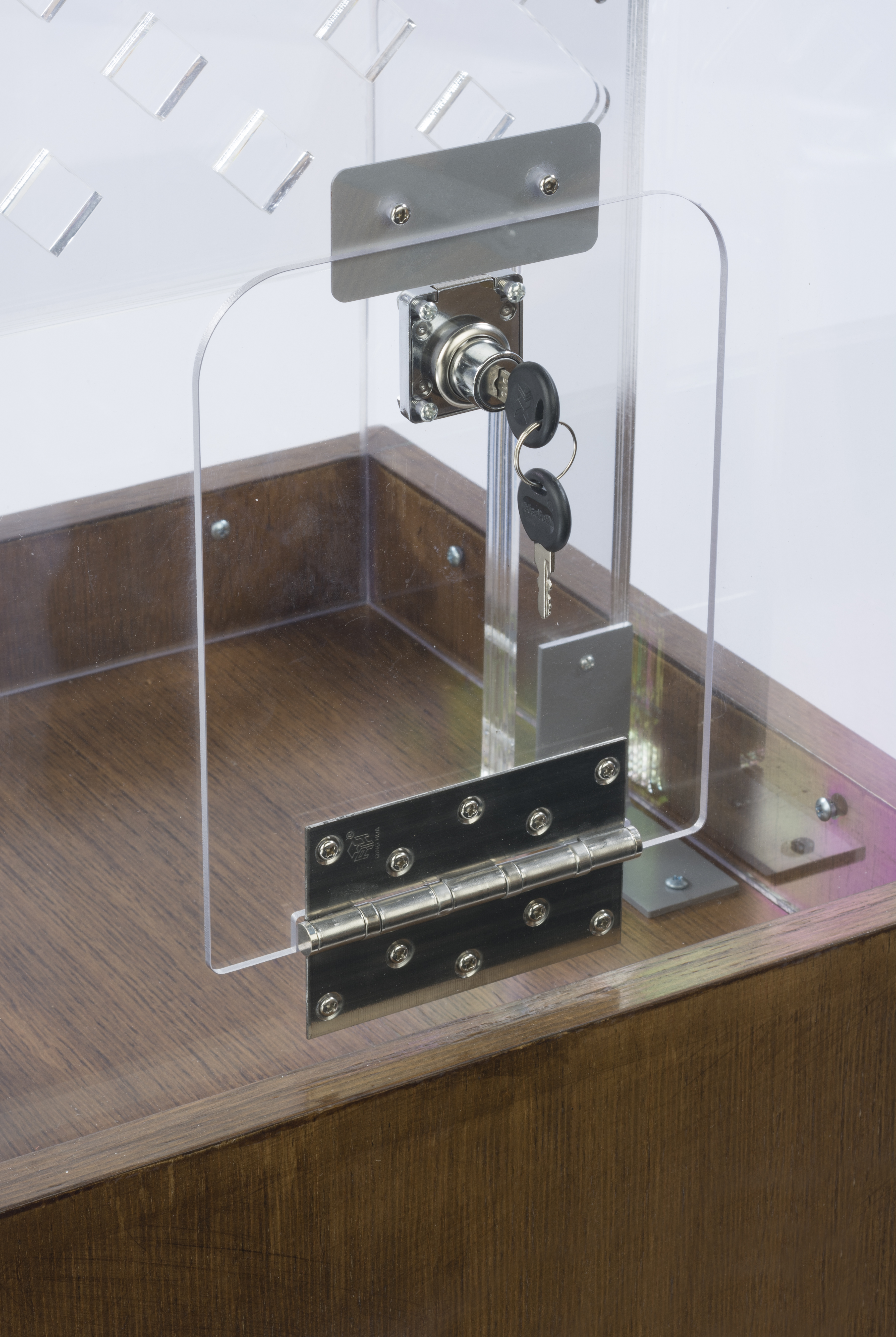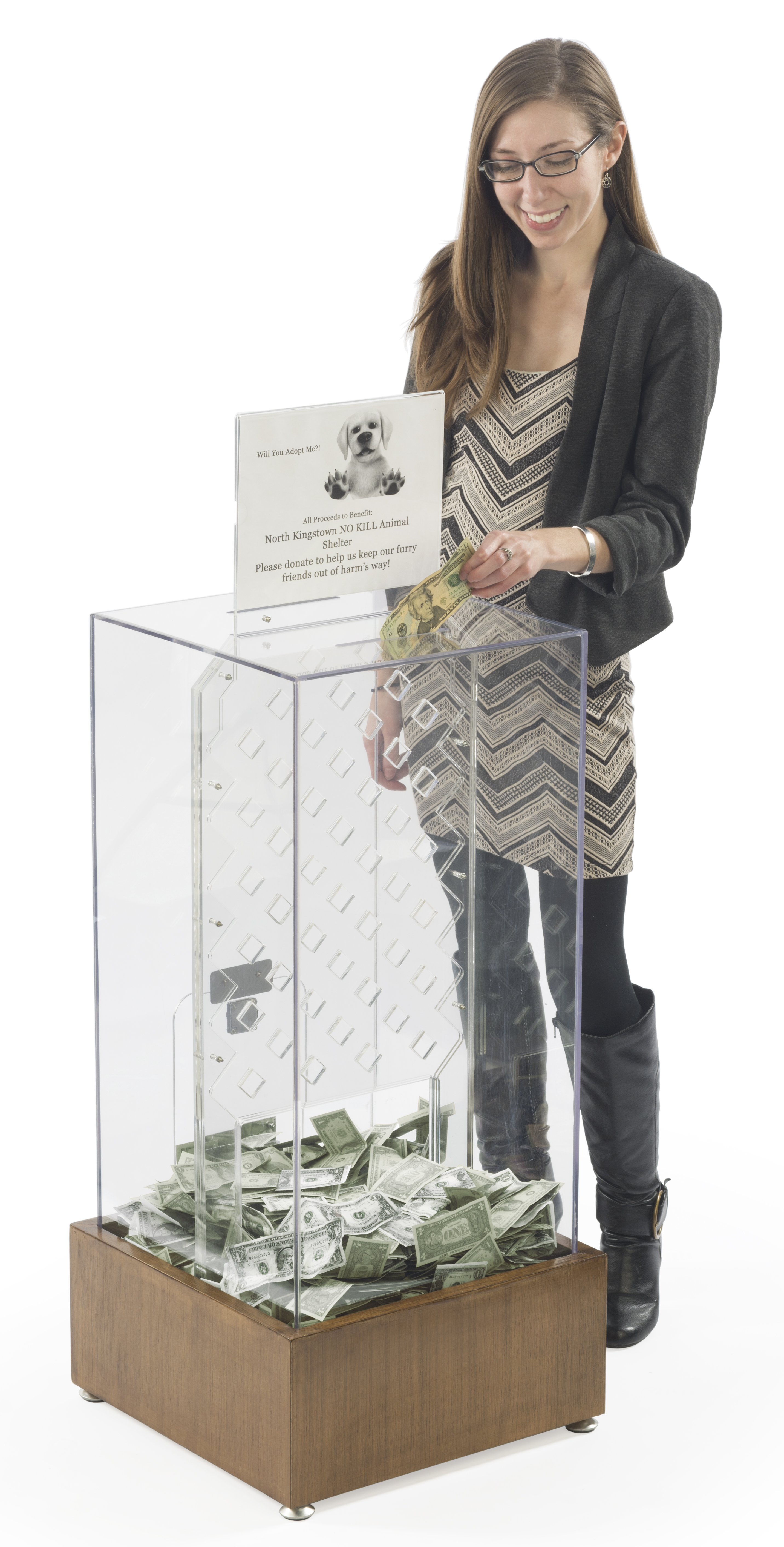Donation Box with Prize Drop Board & Lock, Floorstanding w/ Walnut Wood Base – Clear