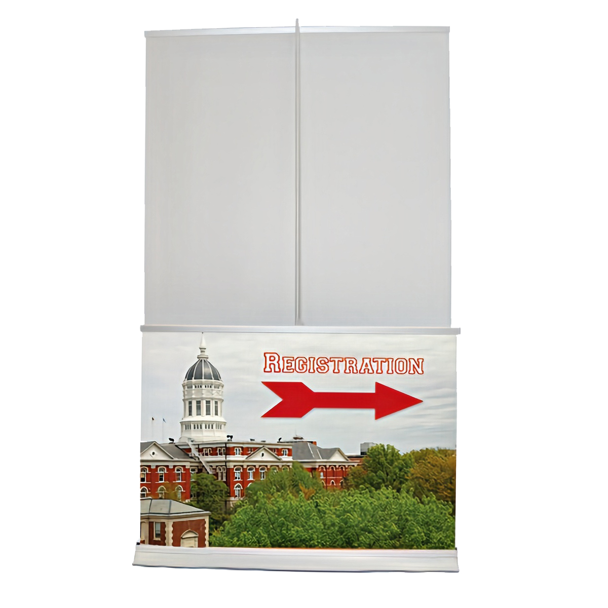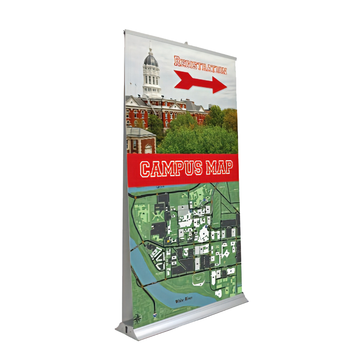 Have a high-traffic event or company space that requires a resilient advertising display that will effectively showcase your message for optimal marketing efficiency? Optimize your display with the double-sided premium banner stand. This resilient and stunning double-sided retractable pull-up banner stand features two full color printed banners to showcase your business, brand, and marketing message on the best-selling premium banner stand. With a user-friendly double-sided aluminum banner stand, setup and break down are fast and efficient. Double the exposure to your audience and passersby as two banners capture attention with vivid, vibrant colors. Stand out at high traffic trade shows, events, shopping malls and other areas where your business could benefit from increasing brand visibility. The banner and double-sided banner stand fit into a convenient tote bag ideal to carry, transport, and ship.