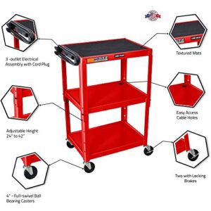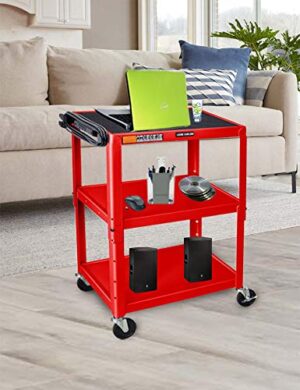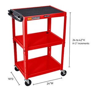 Colorful LUXOR Duraweld Adjustable-Height Audio-Visual Cart organizes specific department instrumentation, inventory and supplies. Arc-welded steel: 20-ga. steel shelves and 14-ga. steel legs. Ribbed runner mat on top shelf provides extra protection and prevents items from sliding off, while the roll-formed shelves are surrounded by 1/2″ retaining lips. Cart height adjusts in 4″ increments. Includes 3-outlet power strip with 15′ UL- and CSA-listed cord, integral push handle, and cable pass-through holes. 4″ rubber swivel casters-(2) with locking brake. Ships unassembled.