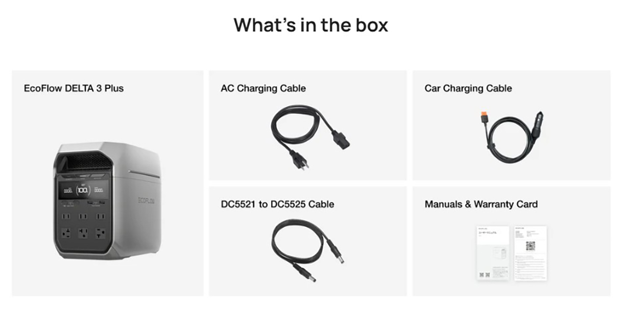 Includes:AC Charging Cable, Car Charging Cable, DC5521 to DC5525 Cable, User Manual, EcoFlow Warranty Card
