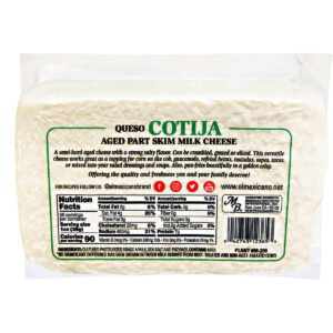 A hard, cream colored, aged cheese made from cultured pasteurized USDA grade A milk, salt and enzymes. Queso Cotija Cheese is aged under controlled environment for flavor enhancement. It is dry and granular textured with a salty and sharp flavor much like a Parmesan Cheese. Queso Cotija is characterized by 35-42% moisture, 3.5-5% Salt, 5-5.5 pH, and 25-35% milk fat.