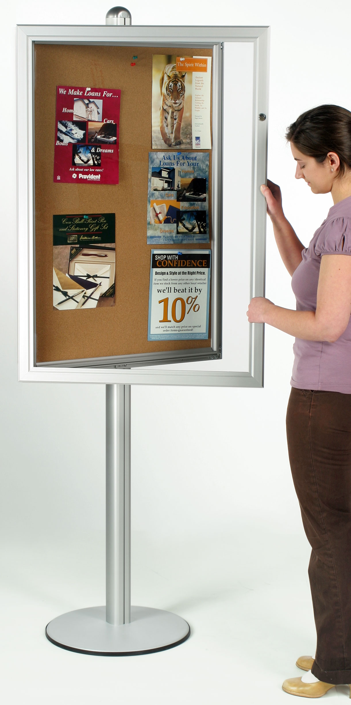 This enclosed bulletin board is ideal in schools and universities. It is also popular in hotel & bank lobbies, business offices and in restaurants. This floor standing display, the enclosed bulletin board features a cork board display surface and two locks. This combination gives you a unique, easily changed and tamper proof display board.