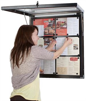 This enclosed swing frame is a perfect way to communicate information in any common area. The bulletin board, outdoor menu case is constructed from aluminum with a powder coated black finish. Each unit is durably constructed to last for many years to come. This notice board, black outdoor menu case provides users ample space for displaying a variety of postings. The sign holder can be used to show schedules, maps, menus, directories, upcoming events or important announcements. This outdoor menu case that has a magnetic blackboard surface can display up to (4) 8-1/2″ x 14″ sheets. Printed materials can be easily attached to the board by using the little round magnets included with the unit. The fact that this wall-mount outdoor menu case has an interior board that is magnetic also makes it easy for users to update the postings frequently! Therefore, for places needing to change their messages regularly, this bulletin board is a great option.