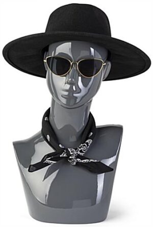 This pewter female mannequin bust is a great countertop dress form for any retail setting, large or small. Each store display figure measures 18.75”h which provides ample space to showcase a variety of fashion accessories. The mannequin bust with abstract facial features is a great fixture for promoting new sales and high trend items such as sunglasses, scarves, hats, wigs and hairpieces! Use the mannequin bust to bring attention to all kinds of store merchandise! Buy a fashion figure to show off a wide variety of retail items!