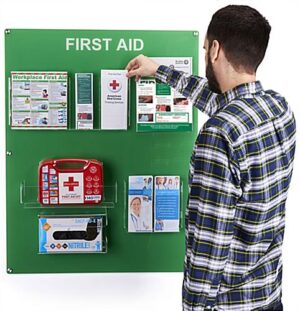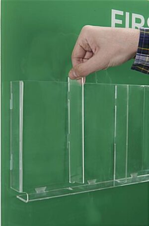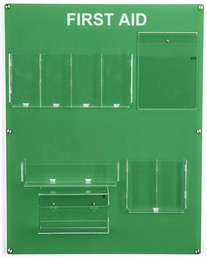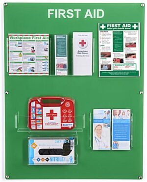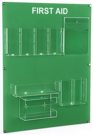 This wall-mounted first aid station keeps valued guests safe and promotes important information about your doctor’s office, restaurant, school, or gym. The durable acrylic attachments are designed to hold a small medical kit and a box of disposable gloves right alongside an 8.5″ x 11″ sign and up to six pamphlets. Easily mount this safety board to most walls with the included standoffs to save on floor space and keep your emergency supplies handy. Use this green wall-mounted first aid station with PPE compartments and pre-printed messaging to make your environment safer for guests and promote health information.