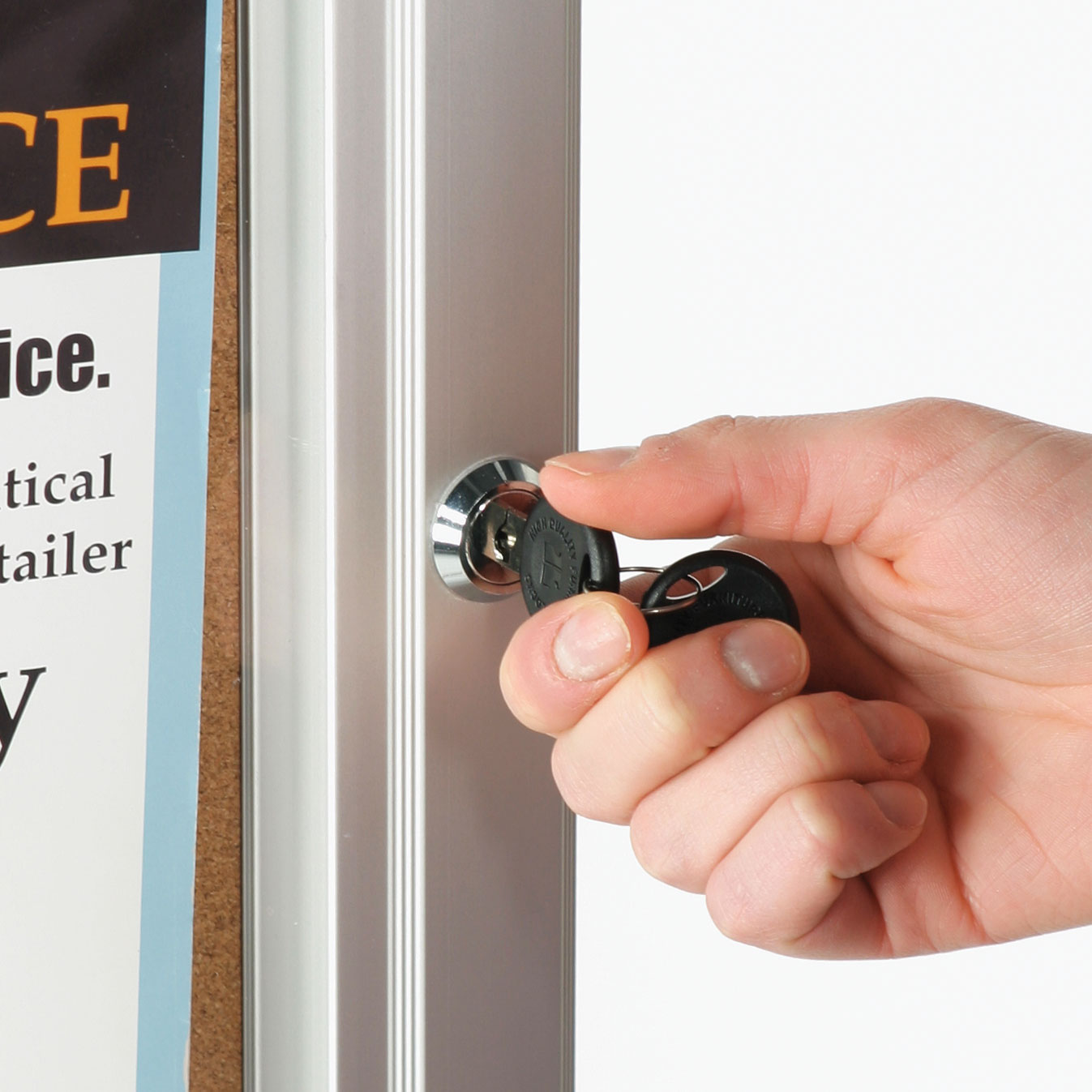 The display surface is cork material. The center pole, weighted base and frame are constructed from brushed aluminum. The corkboards, directory boards and other bulletin boards have an adjustable height. To change the height of your enclosed bulletin boards, loosen the connector bracket and slide the board to your desired height on the pole. Initial assembly consists of attaching the base to the pole and the cork boards to the pole. We provide these enclosed bulletin boards with push pins, a set of keys and hardware to attach the board to the pole.
