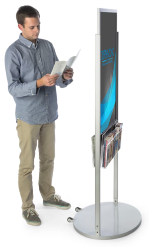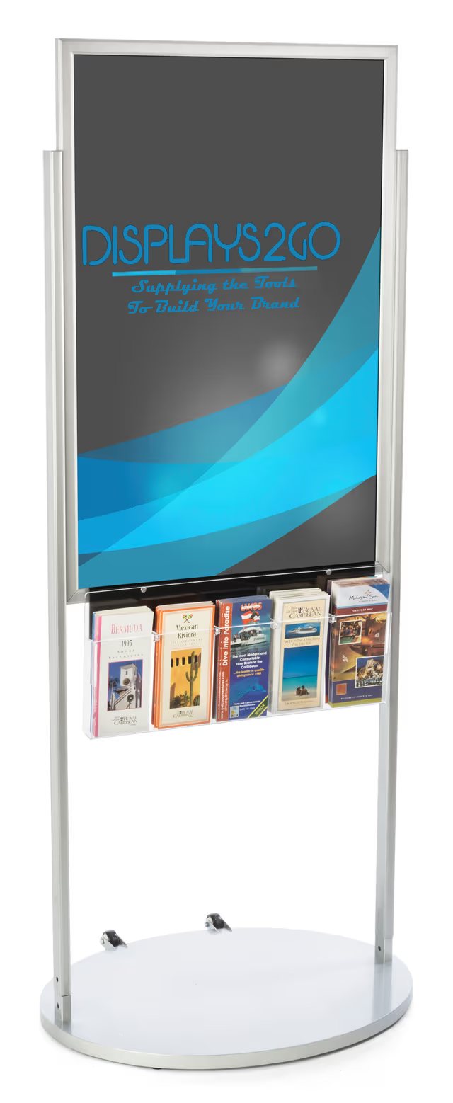 This wheeled poster stand is a versatile mobile display designed for high-traffic environments such as retail stores, trade shows, and business lobbies. Featuring a durable aluminum or glossy black frame with a top-loading design, it accommodates large 22″ x 28″ or 24″ x 36″ graphics secured by PVC backers and anti-glare lenses. The stand includes clear acrylic literature pockets, available in configurations of five or ten compartments, allowing brochures, pamphlets, and magazines to be organized and easily accessible on both sides. Built with attached wheels for effortless mobility, this double-sided display ensures maximum visibility and flexibility for promotional materials. Quick assembly and a sleek, professional finish make this poster stand an ideal solution for showcasing advertisements and informational content.