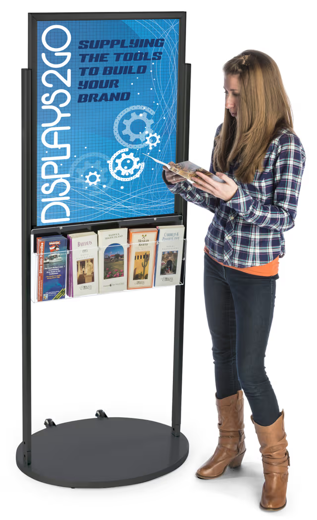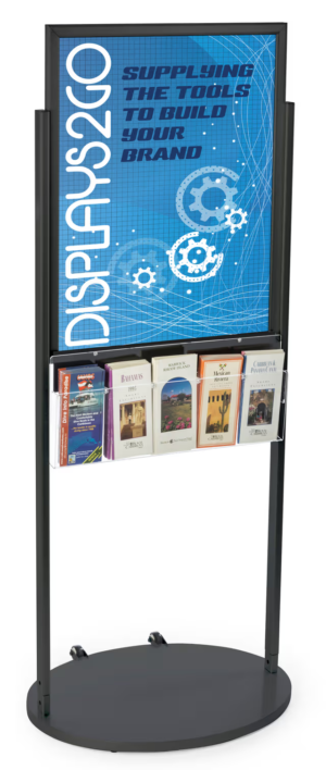 This wheeled poster stand is a versatile mobile display designed for high-traffic environments such as retail stores, trade shows, and business lobbies. Featuring a durable aluminum or glossy black frame with a top-loading design, it accommodates large 22″ x 28″ or 24″ x 36″ graphics secured by PVC backers and anti-glare lenses. The stand includes clear acrylic literature pockets, available in configurations of five or ten compartments, allowing brochures, pamphlets, and magazines to be organized and easily accessible on both sides. Built with attached wheels for effortless mobility, this double-sided display ensures maximum visibility and flexibility for promotional materials. Quick assembly and a sleek, professional finish make this poster stand an ideal solution for showcasing advertisements and informational content.