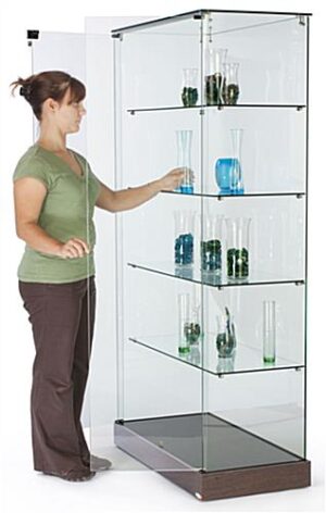These 4″ base frameless tower displays are a standard fixture for many retail stores. The cases are full-height, offering up to five levels of space to showcase items! The frameless tower displays that are 35-1/4″ wide, also known as glass cabinets, hold various goods, from trophies, awards, plaques or sports memorabilia to glassware, fine china, electronics, handbags, cosmetics and more! These showcases are part of the EuroVū Simplice line of cases, offering exceptional European styling and construction at an affordable price. The frameless tower displays that are 17-3/8″ deep coordinate with similar styles from this series, allowing retailers to create a cohesive store configuration. In addition to this size and style, there are also glass counters, cash wraps, countertop cases and more!