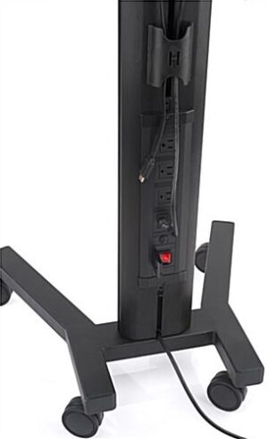 Constructed for convenience and maneuverability, this standing mobile laptop cart is the perfect adjustable station for any work environment. A 25” x 14” black tabletop surface area paired with cable management allows enough room for portable computers, notes, and other materials without being overcrowded. The height adjustable mobile laptop cart can move up or down to accommodate you, whether you want to sit or stand! A black wheeled base promotes maneuverability and can be moved through rooms without hassle. Keep all your devices plugged in and charging with the integrate power outlets and cable management. Get a versatile workstation such as this mobile laptop cart for your office to increase your productivity in an ergonomic fashion.