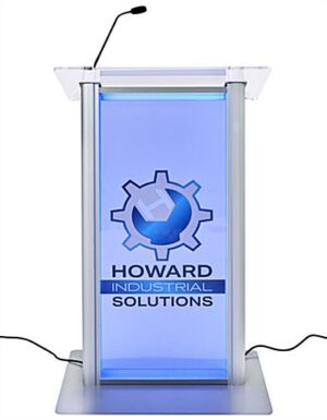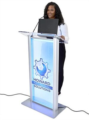 This frosted acrylic light-up podium with logo is a modern pulpit for use at your next business trade show, conference, or lecture. Equipped with a microphone socket (mic sold separately) and AC power cord, the setup process will be quick and hassle-free by simply inserting the mic and cables into proper outlets. This light-up podium with logo offers 16 different LED colors to illuminate the lectern and custom graphics, attracting all passersby. The custom graphic allows companies to showcase their unique brand identity by displaying their full-color design or logo. The angled top panel offers a secure lip to hold notes, laptops, or writing utensils. This LED light-up podium with a logo is the perfect personalized lectern for a business, church, or university.