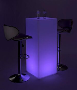 A modern LED tall boy table set creates the perfect mood at a stylish lounge or outdoor event. This battery powered furniture will provide 12 hours of wireless glowing color after a full charge. There are several lighting effects including smooth transition, flashing, strobe, and fade, as well as 16 color options. Use a glowing LED tall boy table set with pneumatic stools to attract attention to your booth at a trade show. The battery powered, lighted furniture unit has an IP45 rating for dirt and water-resistance, so it’s a perfect way to add light to outdoor celebrations. There are two white leatherette stools included with the LED table set for stylish and comfortable seating at a lounge or cocktail party.