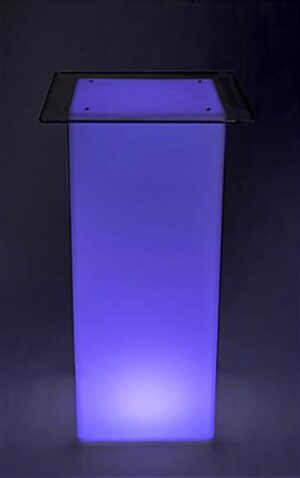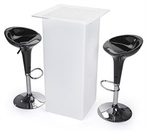 Add a glowing high boy cocktail table set with LED lighting to your lounge for an instant mood lift. The illuminated nightclub furniture has 16 different light colors, with brightness and fade effects on the included remote control. The high boy cocktail table set with LED lighting is rated IP45 dust and water resistant, so it can be used outside in light weather at a party or event setting. This nightclub furniture has a built-in rechargeable battery, so the lounge can be illuminated for 10-12 hours. The cocktail table set with LED lighting includes a clear acrylic top and 4 clear screws, so you can place a viewable paper menu or party information underneath.