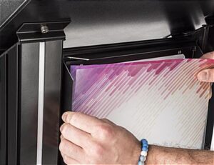 Promote your brand with this LED podium with graphic sign that includes easy-to-use downloadable templates. Aluminum and MDF construction offer durability while the black finish and illuminated side strips provide a modern display. Place notes or reading materials into the podium with pull out drawer for quick access while speaking at exhibits or events. Your customized sign or visuals can be inserted in front of the light panel by simply sliding them in with the included non-glare lens. Display your brand or company name for promotion at exhibits, schools, or other events. Bring your visuals to life with this podium that includes a light panel that will create an exciting presentation experience.