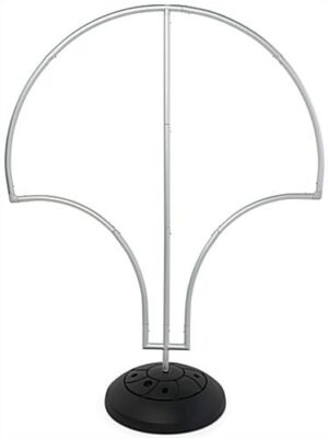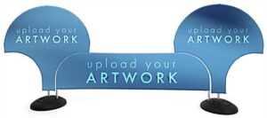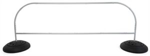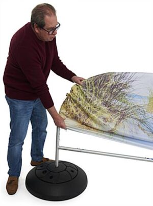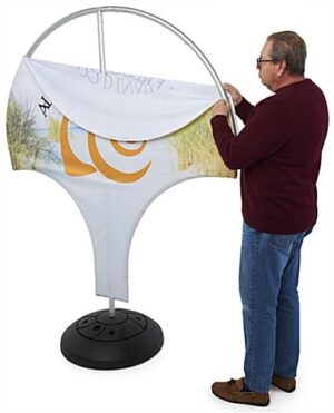 This outdoor fabric tube barricade feature is a custom printed display to attract passersby to community events, concerts, restaurants, and marathons. The two black plastic bases can be filled with either sand or water, providing a sturdy self-supporting base for the mushroom-style shape signage and barrier stand. This crowd control outdoor fabric tube barricade features custom printed graphics on polyester knit material for limitless branding creativity while withstanding sun and weather elements. Re-configure your display signage by utilizing the center prong and four cavities to create your ideal barrier arrangement for your event. An aluminum snap-tube design allows for a simple setup with minimal tools. The locking frame design with push pins provides a durable stand during high traffic restaurant hours or large gatherings. Our modular outdoor fabric tube barricade will entice passersby to your outside dinner service, concert, and festivals!