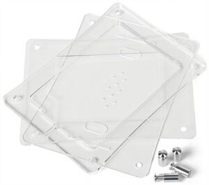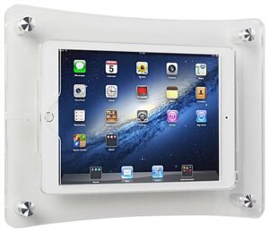 This iPad wall dock is a hands free tablet mount for commercial settings to display digital-based presentations. Four silver standoffs station this frame against a partition in horizontal or vertical format depending on display preference. Compatible with several iPad models, this Apple iPad dock is engineered for the latest technologies. Fix the top acrylic cover so that the home button is exposed or covered dependent on how much access users would like to provide to clientele. An integrated charging port station can be accessed for power while locked inside the enclosure by removing the upper panel of the iPad dock. Three acrylic pieces make up this tablet mount that secures the Apple Air device inside for protection against unwarranted tampering and theft in commercial settings. Included is the Kensington Lock Kit for additional safety in public places.