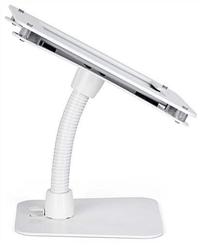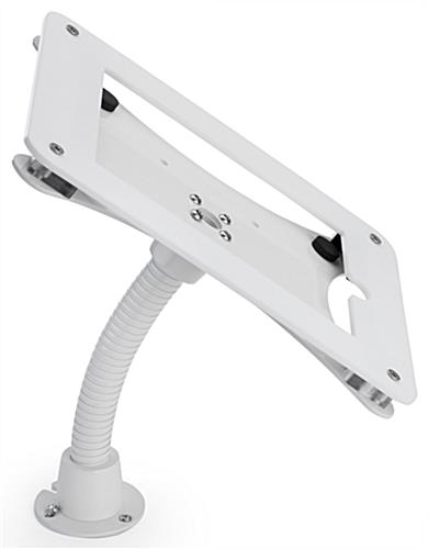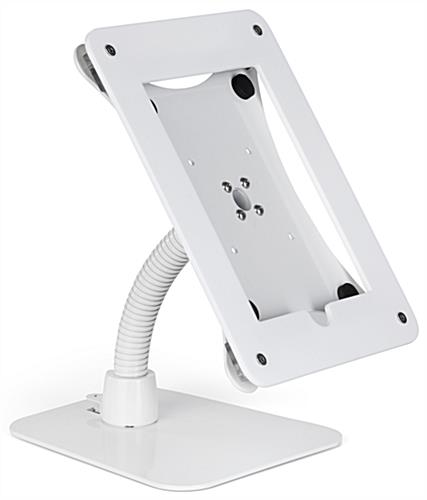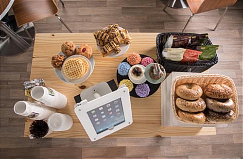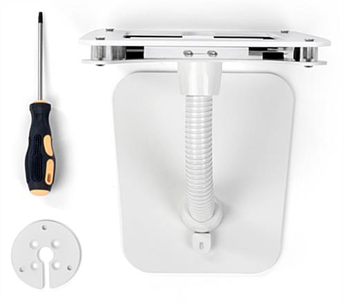 This wall/counter mount iPad frame is a versatile way to integrate a tablet into your business operations. You can choose between permanently mounting the enclosure or using the weighted base. Security screws secure your digital device within the white wall/counter iPad frame and a slot that supports Kensington® brand locks help prevent theft or tampering. A variety of Apple products are compatible with this enclosure. The headphone jack on the tablet will be exposed making this kiosk ideal for use as a secure POS system. This Apple iPad frame with a weighted base is a terrific way to use a digital device in your establishment!
