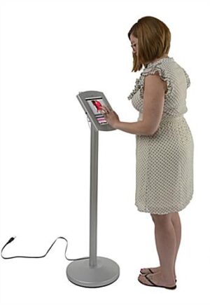 This silver kiosk iPad stand comes with a locking enclosure that tilts and rotates. The versatile mount allows you to display tablets in either landscape or portrait orientation with the home button accessible or hidden. This silver kiosk iPad stand is great for commercial environments, as it offers hidden cable management in the hollow post. The enclosure also has an opening to accommodate a credit card reader. Choose this silver kiosk iPad stand to display touchscreen menus, check-in screens, interactive advertisements or tourist information.