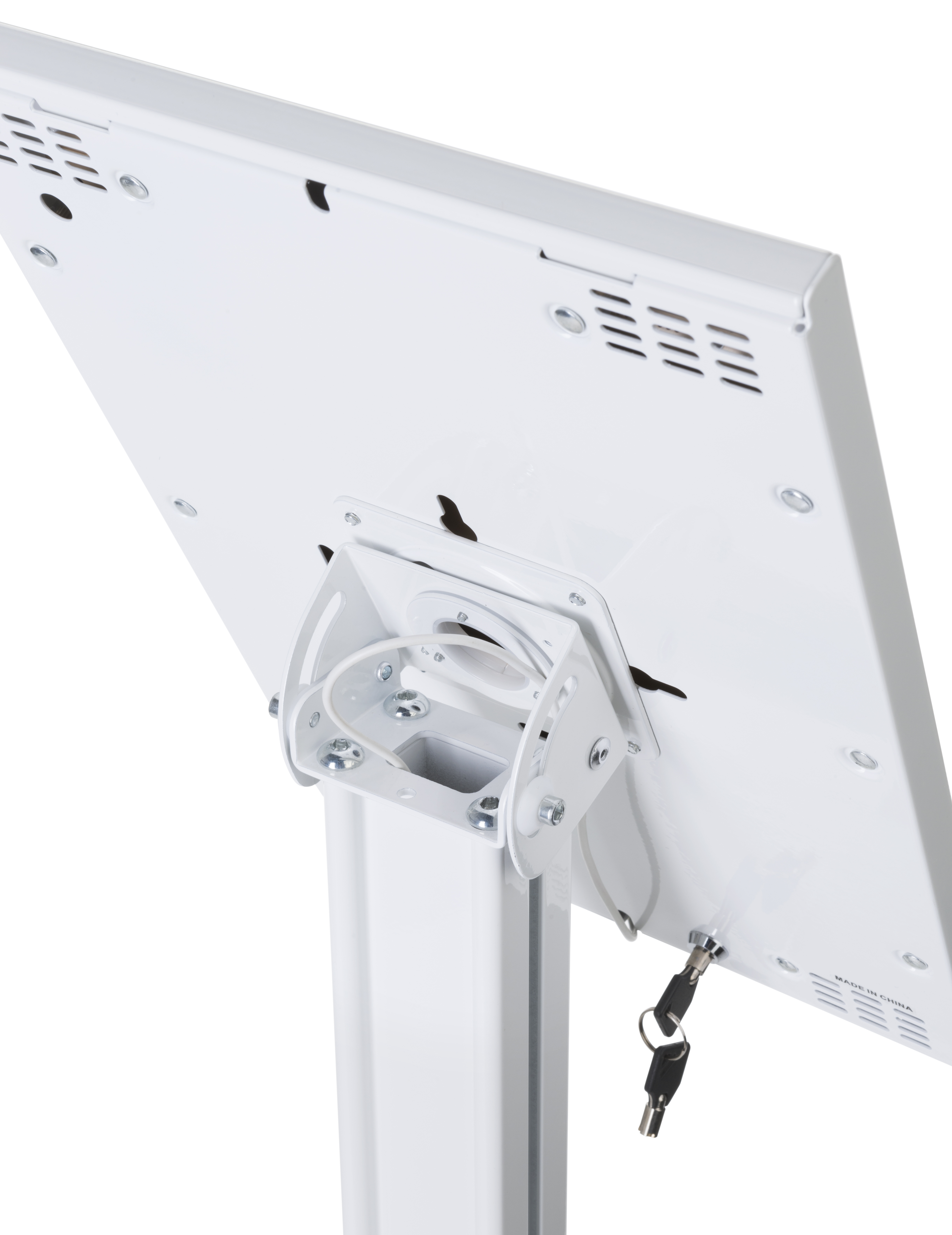 Complete with a locking enclosure, bolt-able base, and steel build, this 12.9 inch iPad pro stand is the secure kiosk solution you’ve been looking for. Each tablet case can rotate from portrait to landscape orientation and tilt up to 75° for an optimal viewing experience. Additionally, the modern stand includes incorporated wire organization to keep your device fully charged in the case. A white finish over the holder offers a contemporary look that is easy to add to your existing décor. Place a stand such as this in entrance ways to offer an information viewing kiosk with promotional brochures that passersby can take as they go. Bring this tablet case holder to your next event to increase customers interaction with your brand.