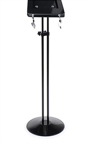 This ipad mini kiosk enclosure is the ideal marketing tool for commercial establishments. Tablet podiums such as these floor stands are commonly used in department stores, libraries, museums, churches, schools as well as many other locations. Each locking ipad mini kiosk enclosure includes (2) sets of keys for securing the unit and deterring theft. This Apple® device holder is height adjustable between 38″ and 65-1/2″ tall allowing the ideal viewing height for virtually any user. The ipad mini kiosk is a great way to bring attention to new sales and promote merchandise. This tablet mount with dual locks features a 360° rotating device case that also tilts 180° for the ideal viewing format.