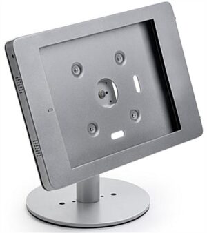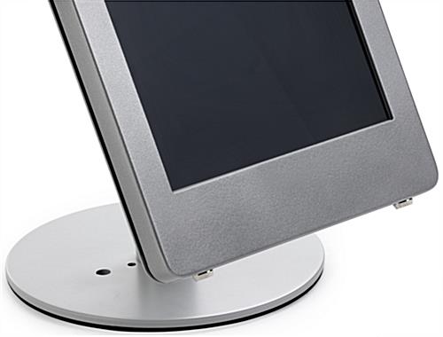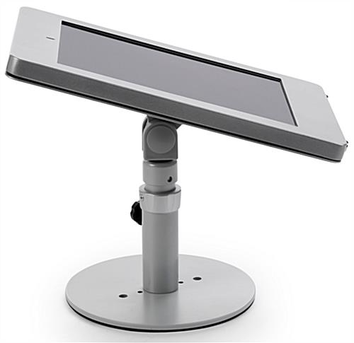 Ideal for use as a POS counter kiosk, this iPad Pro retail stand easily adjusts for a comfortable experience. The aluminum tablet holder is set on an anti-slip base, steel with rubber edges, that features pre-drilled holes to mount the unit to a flat surface with appropriate hardware. Security is a necessity when working with the public, so this locking retail stand is built with 2 locks and a covered home button to prevent tampering. Each tablet kiosk moves smoothly with a rotating and tilting holder, creating a streamline transaction for customer and employee alike. As well, the adjustable pole smoothly adapts for various heights due to the anti-slip base that reduces shaking. During assembly, mount the enclosure in either landscape or portrait setting depending on your business needs. Use this retail stand to save money on a traditional register and create an engaging experience for your patrons.