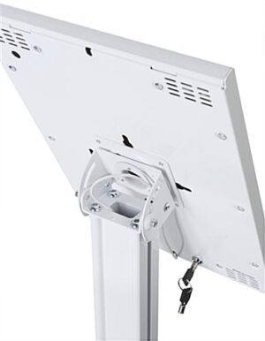 Crafted with durability and a modern eye, this iPad Pro security kiosk is the perfect tablet display for trade shows, retail stores, schools, and more! Aluminum, steel, and plastic construction offer a sheltered enclosure for your 12.9” model that locks for added peace of mind. The floor standing security kiosk enclosure can be rotated from portrait or landscape orientation as well as tilt up to 75° for an easy viewing experience. Incorporated wire organization keeps the tablet display looking clean and professional no matter the environment. Each unit features a wide base that can be secured to the floor for extra stability and theft reduction. Show off your latest promotions, create a customer sign-in area, or create and interactive directory with this kiosk that fits your 12.9” model tablet.