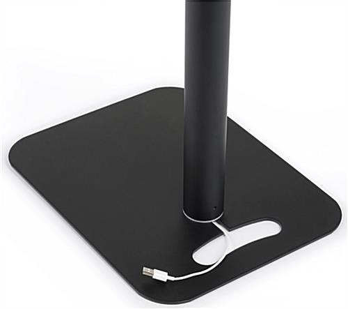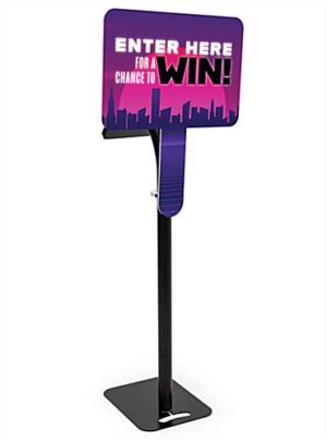 This height adjustable iPad display with graphics comes with a customizable sign and is constructed from durable, high-grade steel and aluminum for long-lasting strength and stability. When each portable self-service kiosk is used with a tablet, guests can access apps and promotional information, sign in, or leave contact information for future sales. This sturdy height-adjustable iPad display with graphics is ideal for retail outlets, trade shows, welcome centers, and other commercial business environments. The 48″ self-service kiosk includes one double-sided sign with attachment clamps that marketers can use for brand messages, business logos, or custom imagery. Users can display the multi-device portable tablet stand on a countertop by removing the header board and foam board attachment pole. This height-adjustable iPad display with graphics features an integrated cable management system that ensures cords are kept out of sight to create a safe and professional environment at welcome centers.