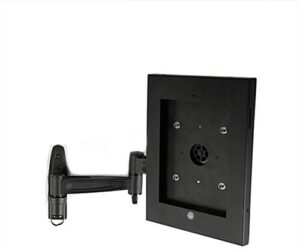 This Apple® device, anti-theft iPad wall arm, allows users to take advantage of a tablet’s capabilities in a whole new way. Each touchscreen kiosk locks the device into the holder, preventing theft or improper usage. The iPad wall arm easily bolts to a wall using pre-drilled holes on the base of the device, and the included hardware. The extension is easily adjustable to suit all users, with a full range of motion. This mountable iPad wall arm, also known as a touchscreen device stand, extends both right and left. When in the portrait viewing position, the kiosk tilts back and forth with a ±5° range. The iPad wall arm that is made of steel and aluminum has a black powder-coated finish to coordinate with most decors. An anti-theft structured mounting case for tablets allows users in hotel lobbies, retail stores, libraries, cafeterias, and other commercial venues to access information on their own.