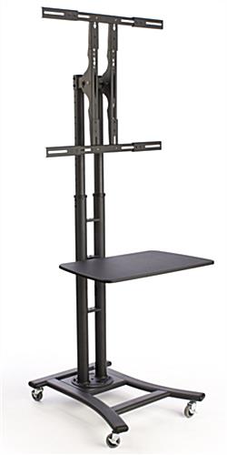 Our tv trolley on wheels have a 28″ shelf included for the placement of electronic peripherals, merchandise, or brochures. The shelf is adjustable to (3) positions, and the bottom of the shelf features clips for wire management, much like glass cabinets found in furniture stores. Plasma pedestals, LED monitor mounts, and other LCD TV stands have lockable wheels on the base. These wheels allow the display to be easily transported between rooms, and then stabilized once in place using the locks. LCD TV stands ship unassembled and include the tools and instructions for fast and simple assembly. These flat screen plasma displays, like glass entertainment centers and furniture cabinets, are made from durable metal and feature a black finish that blends in with any surrounding.