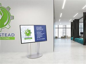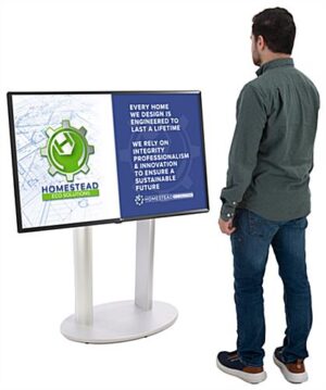 Our digital lobby directory is the ideal solution for retail stores, universities and events. This multimedia display will modernize the way your company conveys its advertising messages to the public. Each large electronic signage stand with a 55″ LG TV screen and ultra HD picture resolution includes built-in SuperSign software that provides a variety of templates for creating dynamic and effective advertisements. Each tilting digital lobby directory features USB, HDMI, and AV ports, as well as convenient WiFi and Bluetooth connectivity resulting in easy displaying of external media. This commercial signage stand is perfect for showcasing brand videos, images, graphics, and analytics! Every display has a monitor mounting bracket that effortlessly adjusts to any angle to meet your specific needs. This 55″ LG TV with a durable rounded silver aluminum base stands on four rubber feet that provide added stability for the electronic unit, especially when in high traffic areas. This aluminum digital lobby directory offers a lot of versatility for the specific needs of your company allowing you to showcase eye-catching advertisements in a new and modern way.