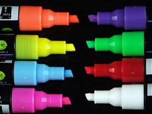 These chalk ink markers are perfect for any business looking to get their messages across. Each fluorescent pen features a bright and vibrant coloration that brings signs and messages to life. These wet-erase chalk ink markers, also known as liquid fluorescent pens, are sold in rainbow-color tones. The set contains markers in 8 colors, including one each of blue, white, green, pink, purple, yellow, red and orange. Each pen has a 3/16″ slanted tip which allows users to produce a wide range of strokes from tiny little details to wide color fill-in. These chalk ink markers that have a chisel tip are perfect for any broad or fine writing on a flashing LED board. Create glowing messages and artwork that draw attention from passersby by using these write-on bright sticks. These chalk ink markers that have brilliant colors captivate any viewer, even from a distance!