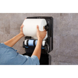 - High capacity dispenser with roll transfer feature that lets you load a new roll while it finishes dispensing the old one
