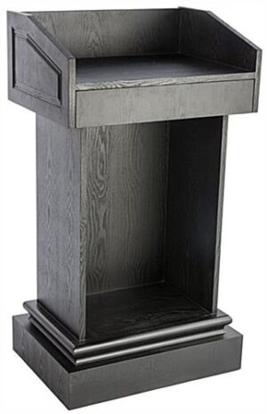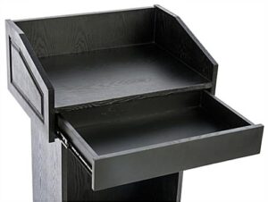 This black restaurant host stand, known as a café podium, has a semi-enclosed reading surface. Each modern lectern is constructed from MDF for durability. The large host stand has a pull out drawer for keeping items out of sight. Each podium hostess station also has an open storage area for holding additional menus and more necessary materials! The host stand has a Featuring a black wood grain veneer, this host stand provides a modern lectern with a contemporary design. Each hostess station is ideal for offices, schools, business, and many other venues.