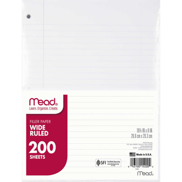 Mead 3-Hole Punch Filler Paper, Wide Ruled, White, 10-1/2” x 8”, 200 Sheets, 2 ct