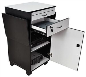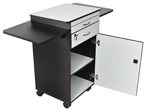 A multimedia stand such as this projector cart is the perfect storage solution for your presentation needs. Use this multimedia stand to hold your laptop, computer, projector, document camera, and all the supplies you need for your audio visual presentation. When your presentation is finished this multimedia stand serves as a storage unit with it’s lockable drawer and lockable cabinet. The inside dimension of the lockable storage cabinet is 17-1/2″w x 22-1/2″h x 17-1/2″d and it includes an adjustable height shelf that can be removed if not needed.