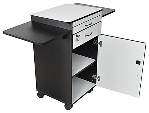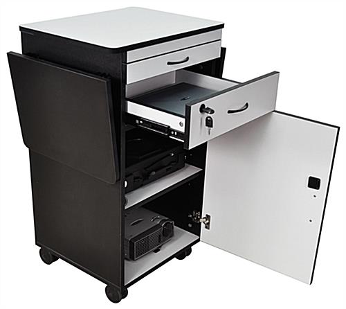 This multimedia stand, also called a projector cart, or av stand is constructed of a durable laminate that makes clean up a breeze. The multimedia stand has (4) furniture grade casters to make moving from location to location simple. Once the multimedia stand has reached its destination simply lock 2 of the casters to keep it in position. Door and drawer handles for this multimedia stand are chrome plated for an added touch of elegance and sophistication. This multimedia stand is incredibly versatile, with multiple surfaces, shelves and a locking drawer and cabinet that ensures security for all your presentation tools!