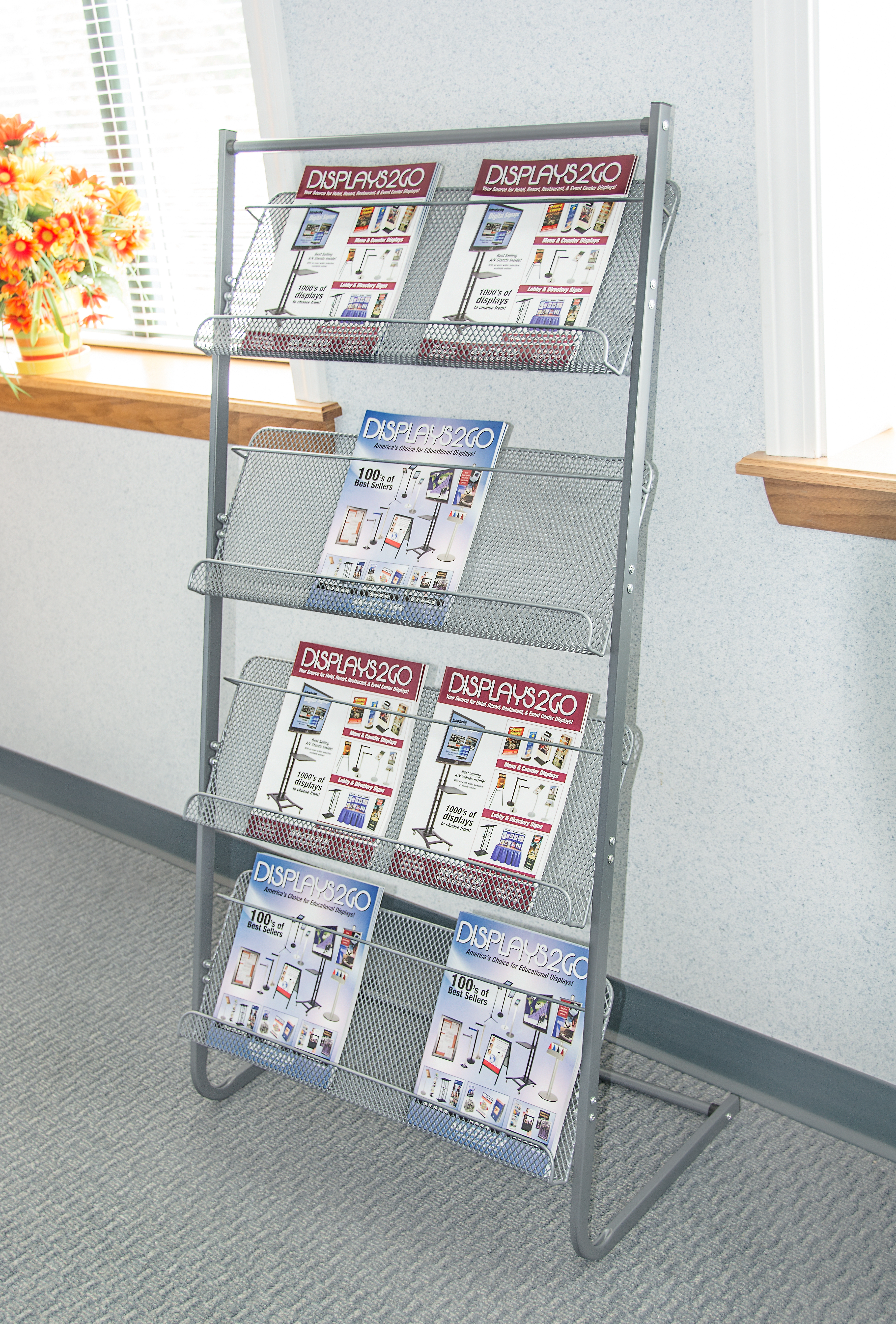 This mesh magazine rack is made from durable metal and is floor standing. Four tiers allow plenty of room to organize and display periodicals. Each metal magazine rack has a gray powder coated finish and an attractive glossy surface. A modern literature stand is a stylish addition to any corporate office, waiting room, library, or sales floor. Organize informational booklets or display brochures for customers to read while they wait with the use of a magazine rack. Each literature stand is designed for durability and includes a steel support bar for added stability. Both corporate businesses and service providers will appreciate the four-tier organizer which also functions as a great marketing tool!